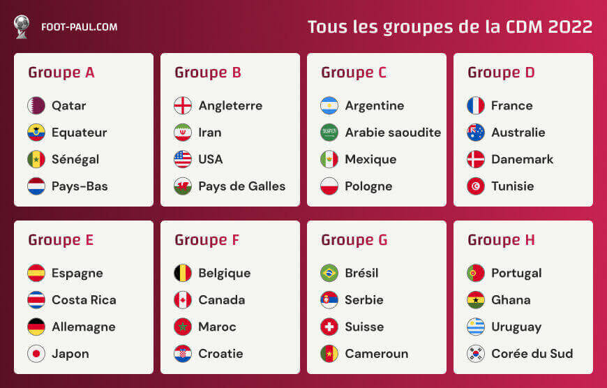La coupe du Monde de football est l’une des grandes compétitions qui intéressent les amoureux du football. Tenue tous les 4 ans, cette 22ᵉ édition de cette coupe aura lieu en novembre 2022 au Qatar. 32 équipes réparties en huit groupes prendront part à cette compétition. Voici dans les grands groupes à suivre durant la compétition.